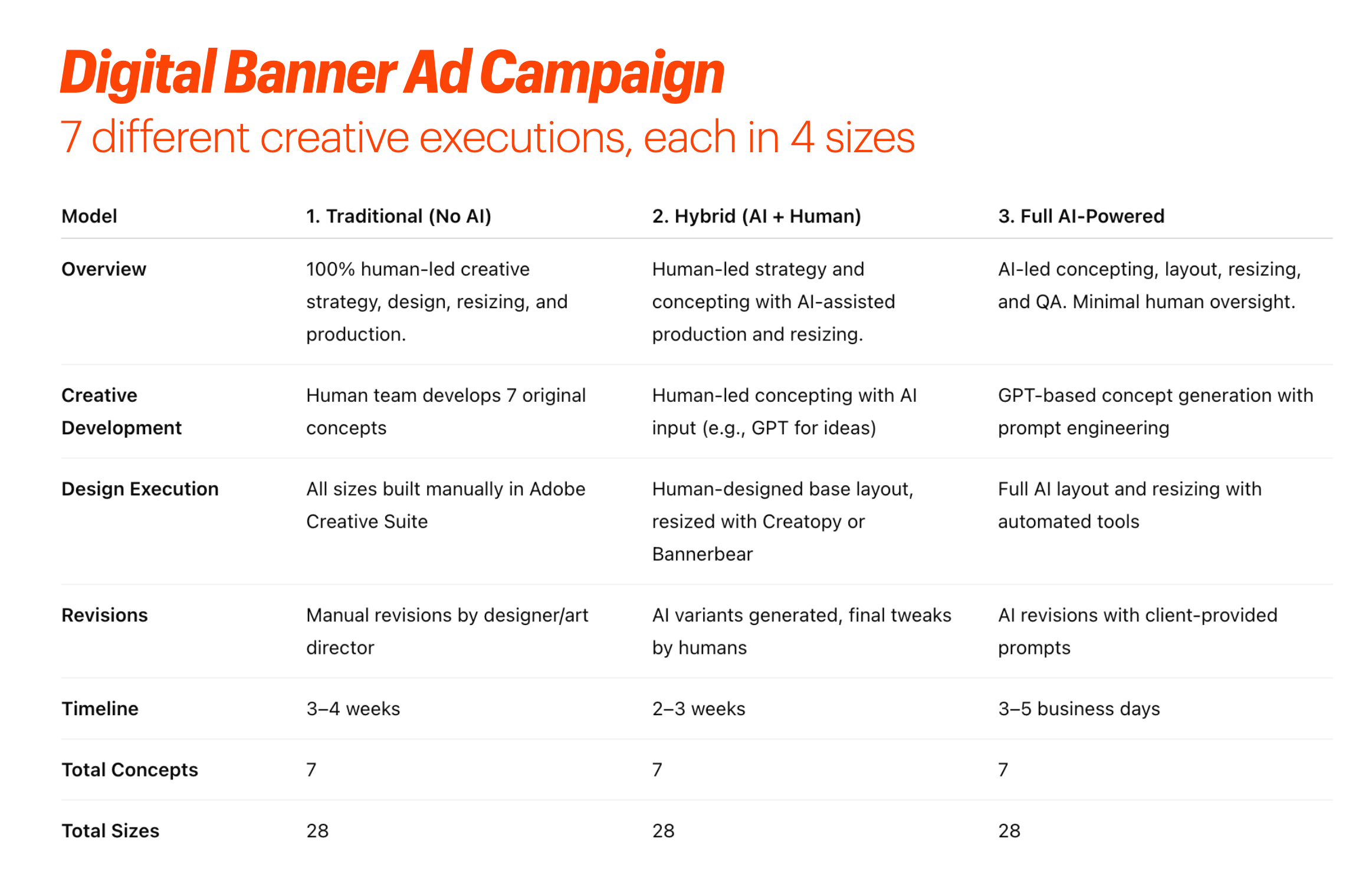 Obviously the cost to the agency varies substantially depending on which path they take for each individual output, but that shouldn’t necessarily dictate the price. The client is buying seven digital banner ads, and it's up to the agency to decide which of the above approaches will produce quality assets delivered in a timely way at a price the client will view as fair.